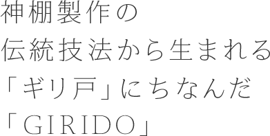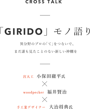 大治氏 小保田さんからそういうお話も聞いて、ますます僕にお手伝いさせていただきたいという気持ちになりました。woodpecker×唐箕屋本店×Oji & Designコラボの新しい神棚、ブランド名はギリ戸にちなんで「GIRIDO」しかないと。